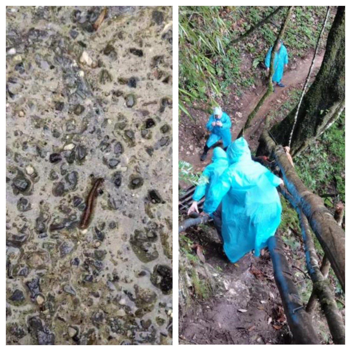 左图:工作人员从身上抖下的蚂蝗  右图:前往样地路途中