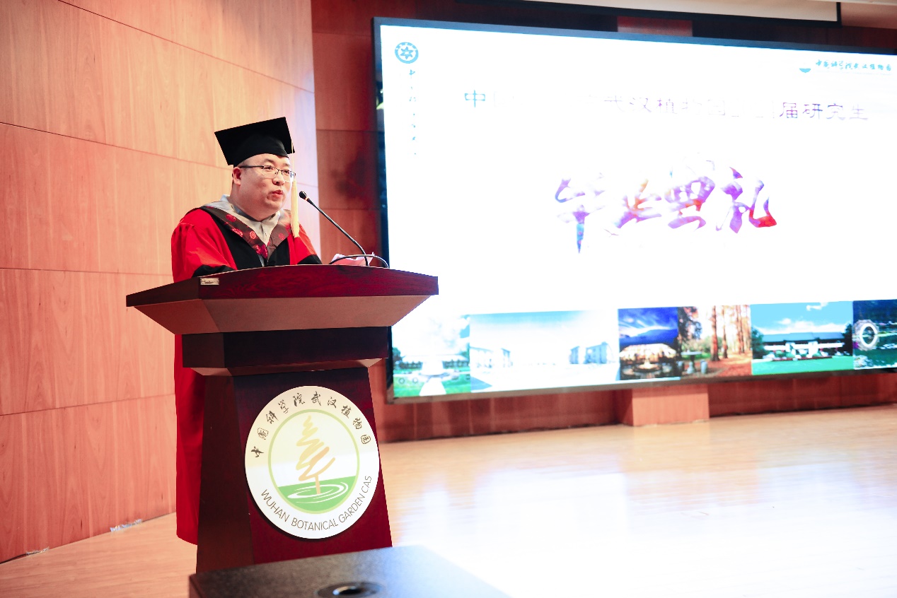 毕业生代表王党军发表题为《爱与成长,致死方休》的毕业感言,表达了对家乡、对祖国的爱,感谢中国科学院和武汉植物园各位老师的精心培养,并祝福所有的毕业生未来身体健康、幸福快乐。他表示经过二十多年的锻炼和科学院的培养,全体毕业生均已具备强健之体魄、独立之精神、批判之思维,未来将会用人性之真善美去面对一切高山低谷。