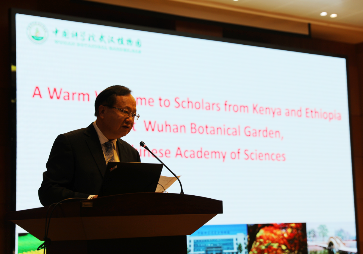 116日上午,中非生物多样性保护学术交流会在武汉植物园光谷园区举行,肯尼亚野生动物管理局局长Erustus Mutembei Kanga、局长助理Hassan Bashir Harun,埃塞俄比亚安波大学校长Bayissa Leta Danno、农业与兽医学院院长Niguse Bekele Dirbaba应邀出席,武汉植物园主任王青锋研究员、副主任黄伟研究员、相关学科组科研人员和研究生共130余人参加了交流,交流会由武汉植物园国际合作与教育处处长严雪研究员主持。