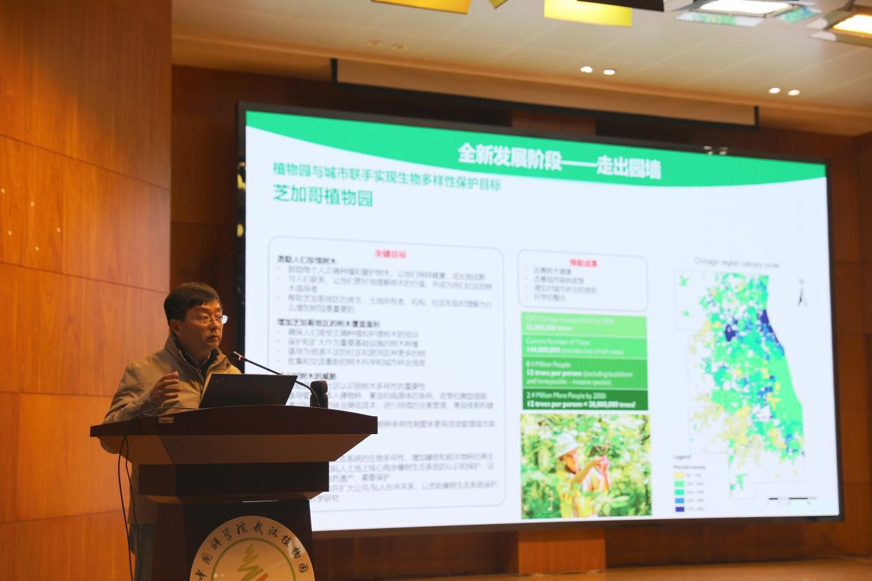 园副主任刘宏涛以《话说植物园》为主题,介绍植物园的类型、发展历程及规划目标,选取具有代表性的世界知名植物园进行特色讲解,并围绕武汉国家植物园建设规划,从物种保育、科普开放、人才培养、植被规划、建筑规划、景点规划、水系规划等方面展开详细介绍。