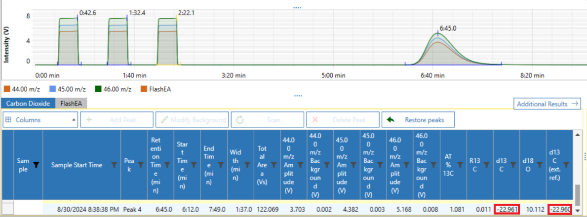 2024年5月24日,平台收到由中国地质调查局武汉地质调查中心寄出的能力验证盲样1份。参测人员基于大磁场稳定同位素质谱仪(赛默飞253 plus),参照GB/T 42490- 2023《土壤质量 土壤与生物样品中有机碳含量与碳同位素比值、全氮含量与氮同位素比值的测定 稳定同位素比值质谱法》收录的化学比对方法,对土壤样品的有机碳δ13C-VPDB值进行了测定。在规定时限内完成测定并上报了结果。由峰型图(图3)可见,δ13C的信号峰型规整,具有较好可信度。2024年12月13日,平台收到比对结果通知单(图1)及满意证书(图2),结果评价为“满意”。