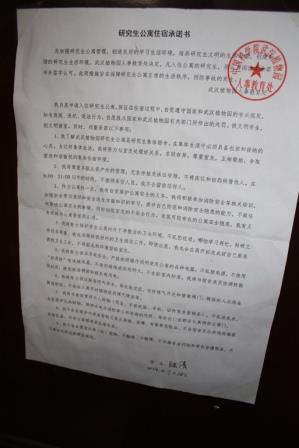 1、研究生赵素婷、张倩按要求将《研究生公寓住宿承诺书》粘贴在公寓内,时刻提醒自己严格遵守公寓的管理规定。