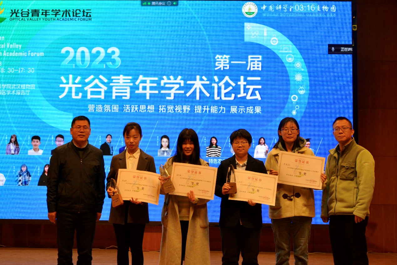 华中农业大学园艺林学学院张飞教授、湖北大学资源环境学院刘杰教授、武汉植物园植物多样性研究中心副主任党海山研究员、武汉植物园水生植物研究中心副主任杨玉义研究员为“优秀墙报制作奖”获奖研究生颁奖
