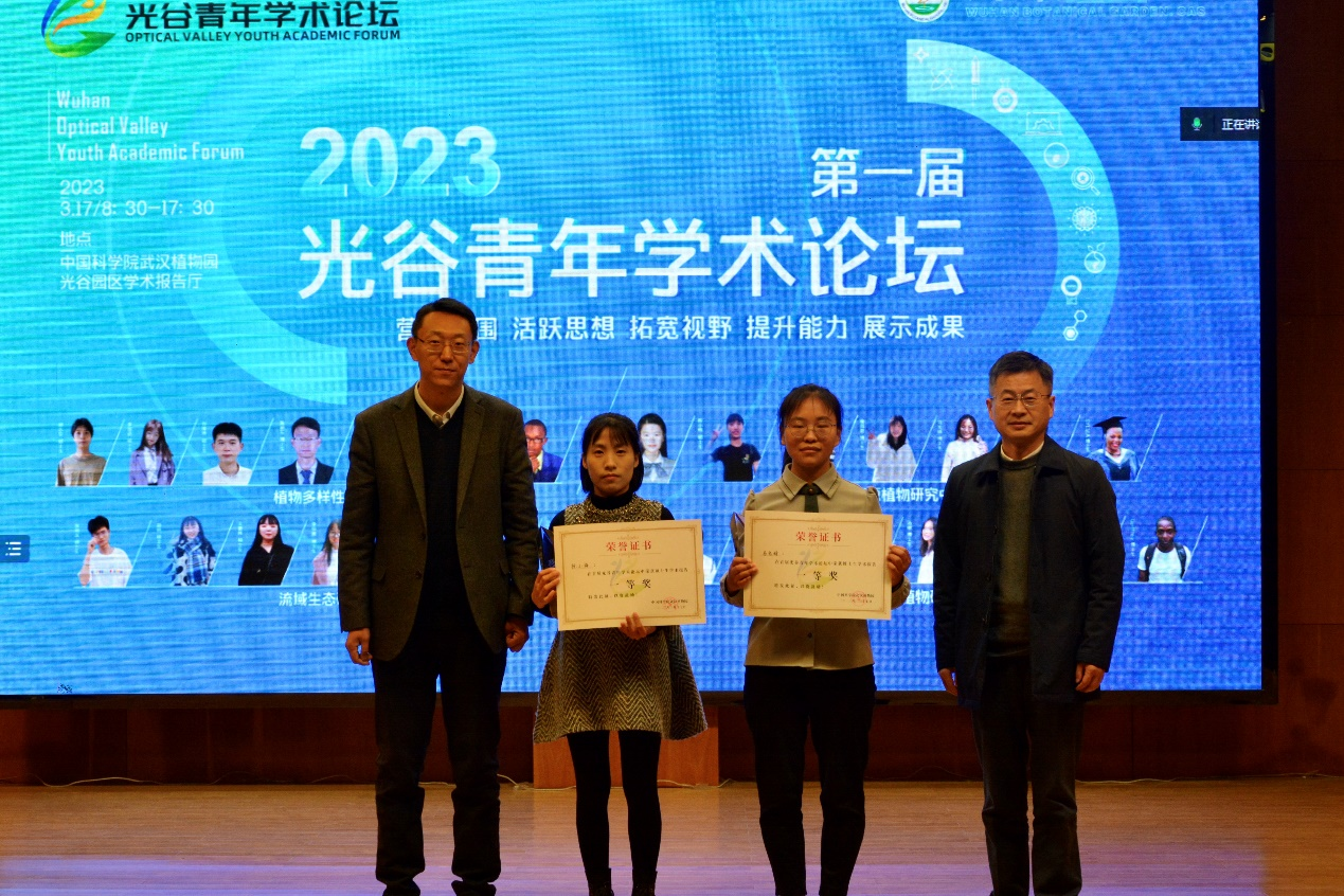 武汉大学生命科学学院副院长刘星教授、武汉植物园副主任黄伟研究员为汇报一等奖研究生颁奖