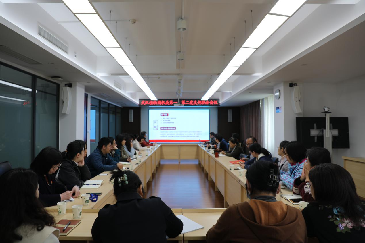 4月25日下午,武汉植物园机关第一党支部和第二党支部在光谷园区联合召开会议。园党委书记、副主任尚纳新,纪委书记徐红革以普通党员身份参会,会议由机关第一党支部书记陈艳主持。会议分为两个阶段。