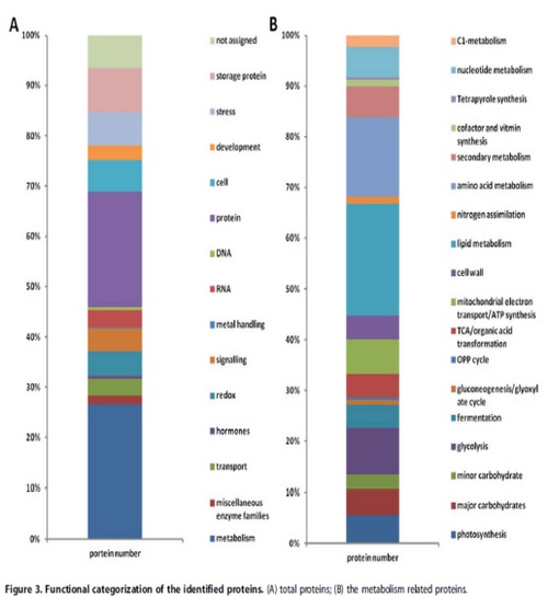 研究发现,大豆种子含有较多的油脂代谢蛋白。其中,lipoxygenase蛋白是其主要组成成分,表明大豆种子中油脂的降解是依赖lipoxygenase对不饱和脂肪酸双键上加氧从而使其断裂而实现的;大豆种子中的蛋白质主要通过蛋白酶和26S蛋白酶体系统降解。此外,通过对大豆种子中活性氧的变化和活性氧类代谢酶的分析说明,大豆倾向于通过自身蛋白质的抗氧化耐受机制,而非通过高效的活性氧清除机制来抵抗活性氧的伤害。