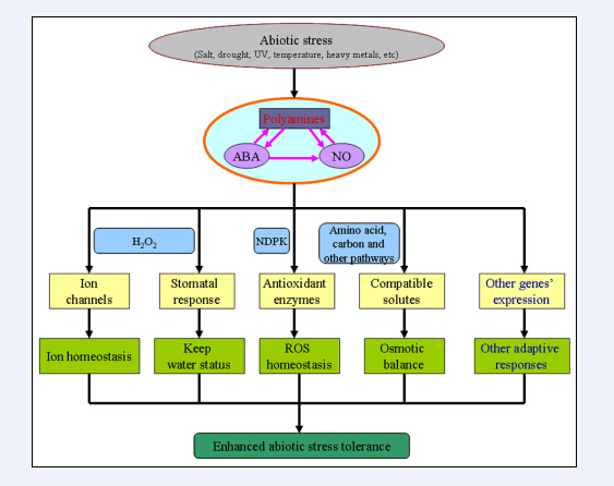 同时,基于前期在多胺与植物胁迫抗性方面的研究结果(Journal of Experimental Botany, 2013, 64 (5): 1367-1379; Plant Signaling and Behavior, 2013, 8 (5): e24138; Journal of Proteome Research, 2013, 12 (11): 4951-4964),并结合国际上大量相关研究的文献资料,施海涛博士在产祝龙研究员的指导下,综述了非生物胁迫过程中,植物体内多胺合成和代谢途径基因表达及多胺含量的变化趋势;外源多胺处理和基因工程改变多胺合成及代谢相关基因的表达与植物非生物胁迫抗性的关系;并重点从多胺、脱落酸、活性氧及一氧化氮等小分子物质的交叉互作角度探讨了多胺调控植物非生物胁迫的分子机理。