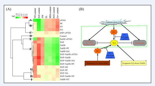 氧化氮和硫化氢供体和清除剂处理在狗牙根应答镉离子胁迫时对相关生理指标的调控(A)及一氧化氮和硫化氢多胺调控狗牙根应答镉离子胁迫的分子机理(B) [Plant Physiology and Biochemistry (10.1016/j.plaphy.2013.11.001)]