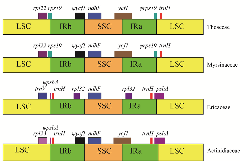 猕猴桃科与近缘物种的叶绿体基因组LSC, SSC以及 IR区边界位置比较