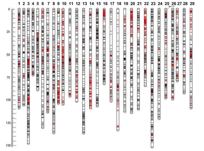 中国科学院植物种质创新与特色农业重点实验室猕猴桃资源与育种学科组助理研究员张琼在黄宏文研究员的指导下,采用山梨猕猴桃和中华猕猴桃种间杂交群体,利用基于第二代测序的RAD-seq技术构建猕猴桃种间高密度遗传连锁图谱。父母本图谱中各有29个连锁群(2X=58),分别包含4214和2426个SNP标记。该图谱能将猕猴桃基因草图中无法组装的440个Scafflold锚定到基因组上,极大提高基因组组装水平。猕猴桃种间高密度遗传图谱不仅为猕猴桃基因组序列精细组装提供了重要参考,并为开展猕猴桃优异性状的QTL定位研究,挖掘相关候选基因奠定了基础。同时,将群体性别表型标记定位在图谱上,锁定性别相关区段在第25号染色体端粒位置,并开发3个性别鉴定标记,用于猕猴桃植株早期性别筛选,利于猕猴桃分子辅助育种。