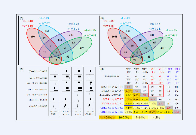 在植物的生长周期里,低温是一个重要的限制因素。植物感受到低温信号以后,CBF/DREB基因受到诱导表达,从而启动下游的COR基因和低温的应激反应。目前人们鉴定了调控CBF/DREB基因的上游作用因子,包括ICE1、CAMTA3、LHY以及CCA1等。但是对于CBF/DREB基因如何在低温条件下受到诱导表达的机理仍不清楚。中科院植物种质创新与特色农业重点实验室产祝龙研究员与上海逆境中心朱健康院士合作,发现rdm4(RNA directed DNA Methylation4)突变体对低温敏感,而转基因植株表现出对低温的耐受性。转录组分析发现,RDM4调控冷害相关的CBF及下游CBF regulon基因的表达。同时RDM4调控的基因有很大一部分与CBF2以及CBF3调控的基因重叠,包括与活性氧代谢相关的途径。以前的研究已表明,RDM4与Pol II相互作用。通过染色质免疫共沉淀技术(ChIP)实验发现,低温条件下RDM4可以协助Pol II富集到CBF基因的启动子区,调控CBF基因的表达。相关的研究阐释了低温信号诱导CBF途径的分子机理。论文发表在New Phytologist上,产祝龙与朱健康是共同通讯作者。
