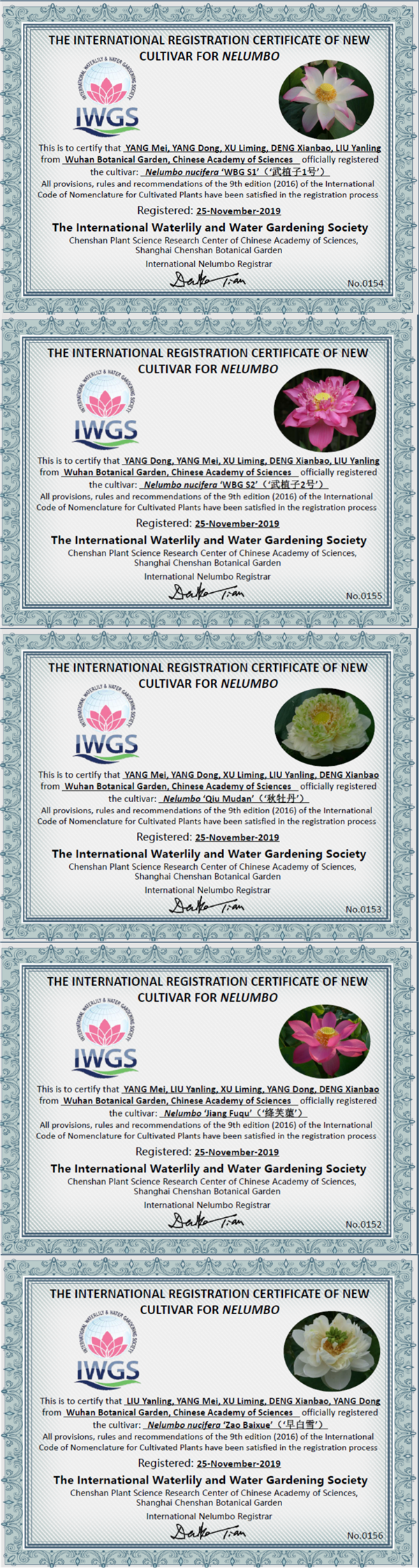 近日,由武汉植物园杨美和刘艳玲等人培育出的5个莲科莲属植物新品种:‘绛芙蕖’、‘秋牡丹’、‘早白雪’、‘武植子莲1号、‘武植子莲2号’喜获国际莲属植物新品种登录权威认证机构——国际睡莲及水景园艺协会协会(IWGS)授予的认证证书,其品种名已获得国际认证。