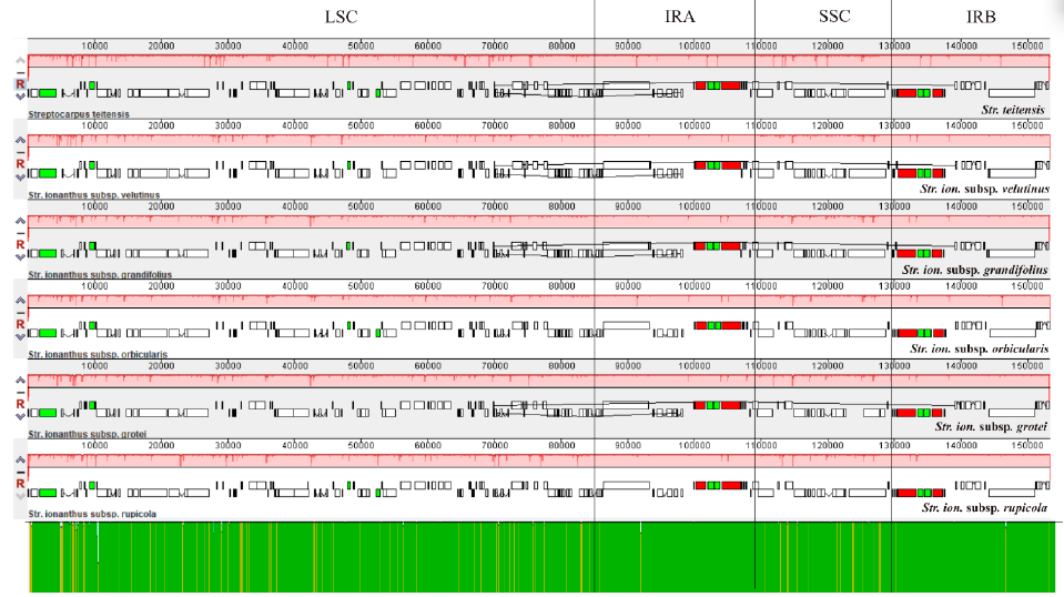 当前,在海角苣苔属Saintpaulia组中仅有一个叶绿体基因组数据被报道,未见到该组中Str. ionanthus的基因组数据信息,重点实验室博士研究生Cornelius Mulili Kyalo对收集于坦桑尼亚和肯尼亚的Str. ionanthus的五个亚种进行了叶绿体全基因组测序,分别为Str. ionanthus subsp. rupicola,Str. ionanthus subsp. velutinus,Str. ionanthus subsp. grandifolius,Str. ionanthus subsp. orbicularis,Str. ionanthus subsp. grotei,其基因组大小从153,208 bp(Str. ionanthus subsp. grandifolius)到 153,377 bp(Str. ionanthus subsp. orbicularis),均编码115个基因。该研究与Saintpaulia组已报道的Str. teitensis进行比较结果显示,基因的排列顺序,基因组结构均表现出高度保守性,在四分结构中,IR区更为保守(图 1)。研究通过IR边界,以及序列上的微卫星(图 2)等方面的比较,均表现出叶绿体基因组的保守性。