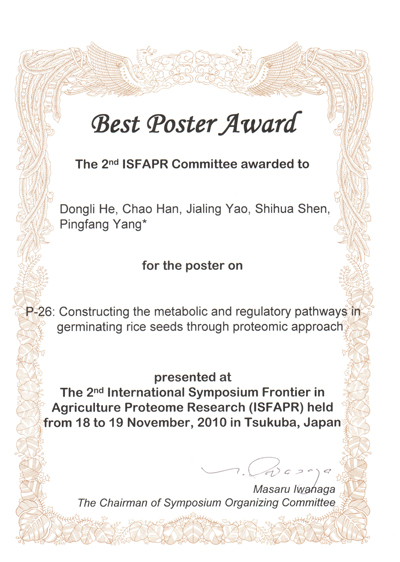 第三届“国际农业蛋白质组学研讨会”于11月18-19日在日本筑波召开。会议主要围绕蛋白质组学策略在植物生物学研究上的应用及其对现代农业的贡献展开了讨论。大会包括口头报告和研究成果展示两大部分。中国科学院植物种质创新与特色农业重点实验室资源植物繁殖生物学学科组杨平仿研究员应邀参加了本次学术研讨会,并在会上做了题为“利用蛋白质组学研究植物种子萌发机理”的学术报告。报告获得与会代表的一致好评,以报告内容为主体的研究成果展示获得本次大会的最佳展示奖“Best Poster Award”。