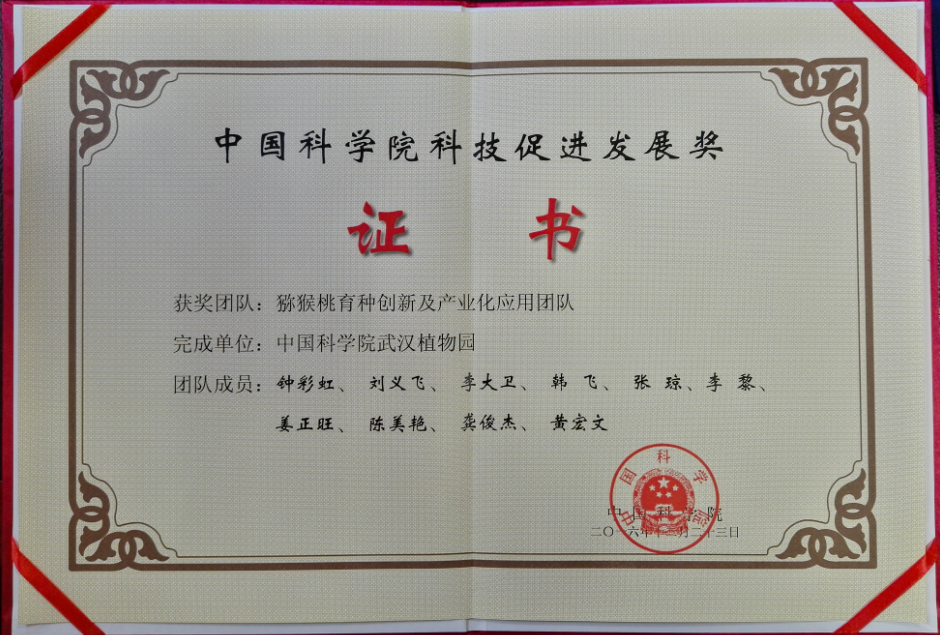 近日,中国科学院公布了关于表彰2016年中国科学院科技促进发展奖获奖团队的决定,武汉植物园“猕猴桃育种创新及产业化应用团队”获此殊荣。团队成员:钟彩虹、刘义飞、李大卫、韩飞、张琼、李黎、姜正旺、陈美艳、龚俊杰、黄宏文