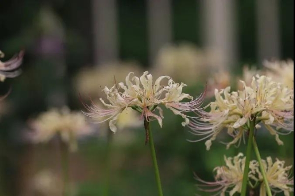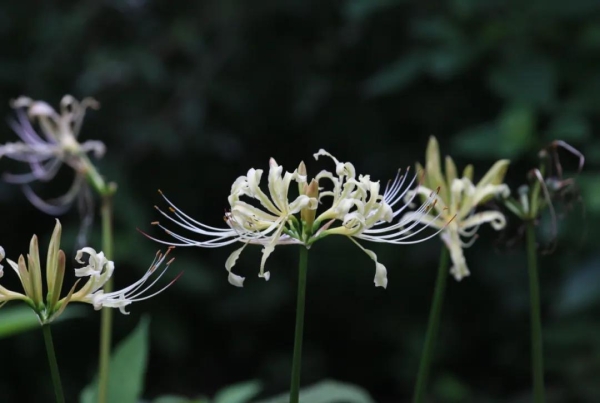 江苏石蒜花白色,花瓣强度皱缩反卷,背面有绿色中肋,其自然花期相对较晚,一般在九月开放。