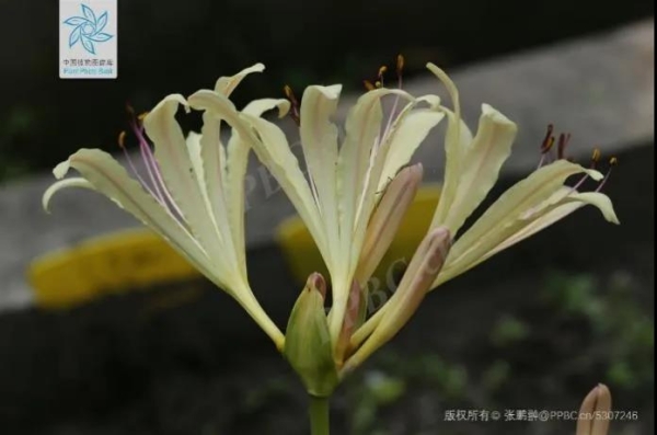 乳白石蒜又称白花石蒜,开花时,颜色逐渐变化。先是桃红色的花蕾,开放时黄色,再渐变成乳白色。花瓣中度皱缩反卷,花柱略长于花瓣,柱头呈玫瑰红色。