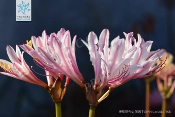 玫瑰石蒜的花茎和花朵都是淡玫瑰红色,花瓣中度反卷和皱缩。